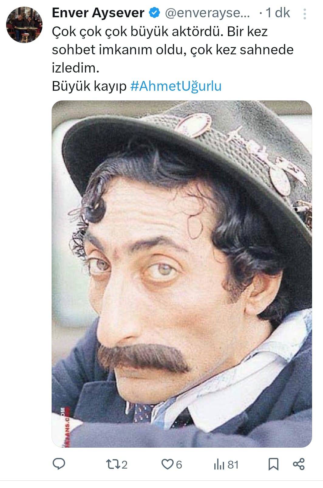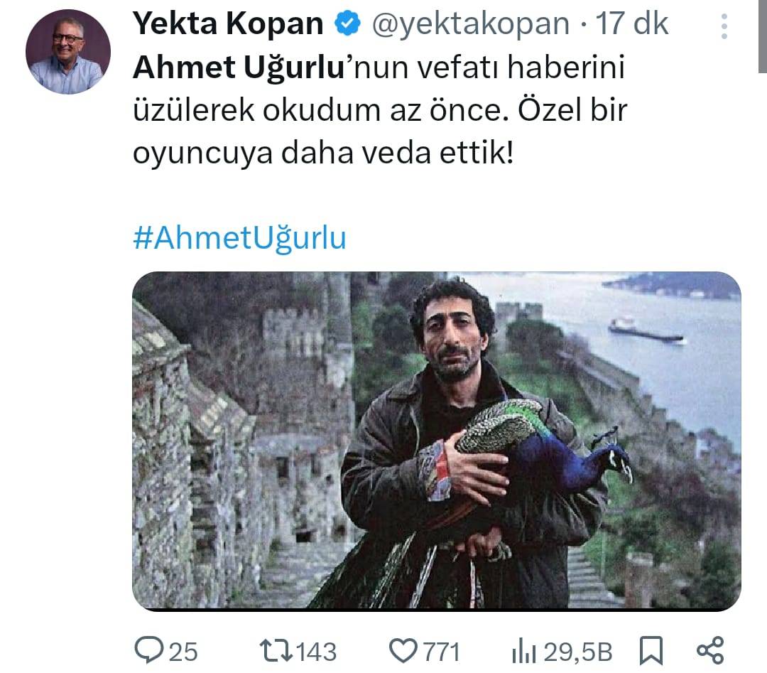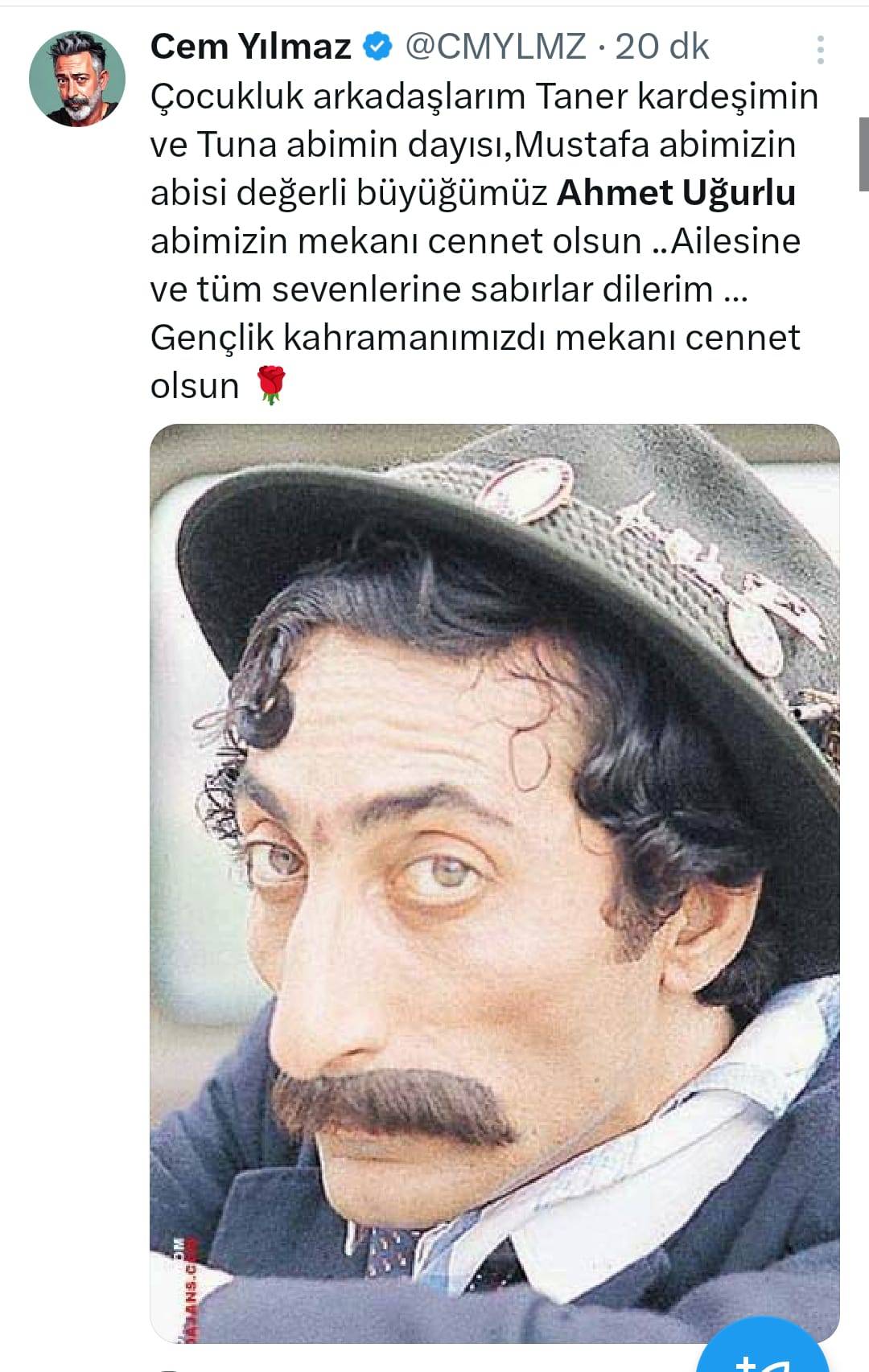 Sinema ve tiyatro dünyasının sevilen isimlerinden 71 yaşındaki Ahmet Uğurlu’nın vefat haberi sosyal medyada sanatçılar tarafından paylaşılarak sevenlerini üzdü. Ünlü komedyen Cem Yılmaz, sosyal medya platformu X üzerinden yaptığı paylaşımda, “Gençlik kahramanımızdı, mekanı cennet olsun” diyerek Uğurlu’nun vefatını duyurdu.