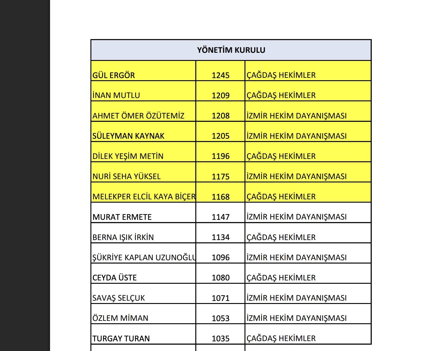 İzmir Tabip Odası yeni yönetim kurulu şu isimlerden oluştu; Gül Ergör 1245 (Çağdaş Hekimler), İnan Mutlu 1209 (Çağdaş Hekimler), Ahmet Ömer Özütemiz 1208 (İzmir Hekim Dayanışması) , Süleyman Kaynak 1205 (Hekim Dayanışması), Dilek Yeşim Metin 1196 (Çağdaş Hekimler), Seha Yüksel 1175 (İzmir Hekim Dayanışması), Melekper Elcil Kaya Biçer 1168 (Çağdaş Hekimler)